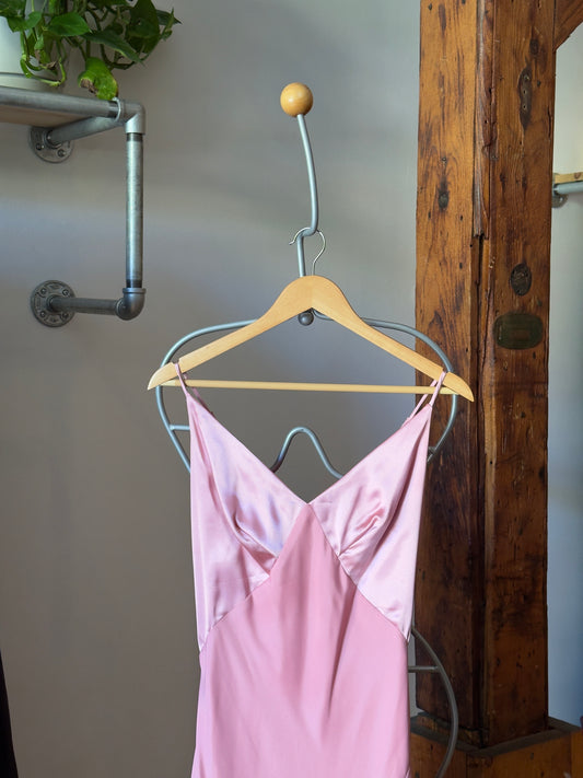 Vintage 90's Pink Satin Chiffon Evening Dress with Contrasting Bust and Leg SlitRegular price $195.00 USDRegular priceUnit price / per-