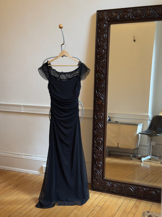Vintage 90's Black Ruched Evening Dress with Ruffled Sleeves