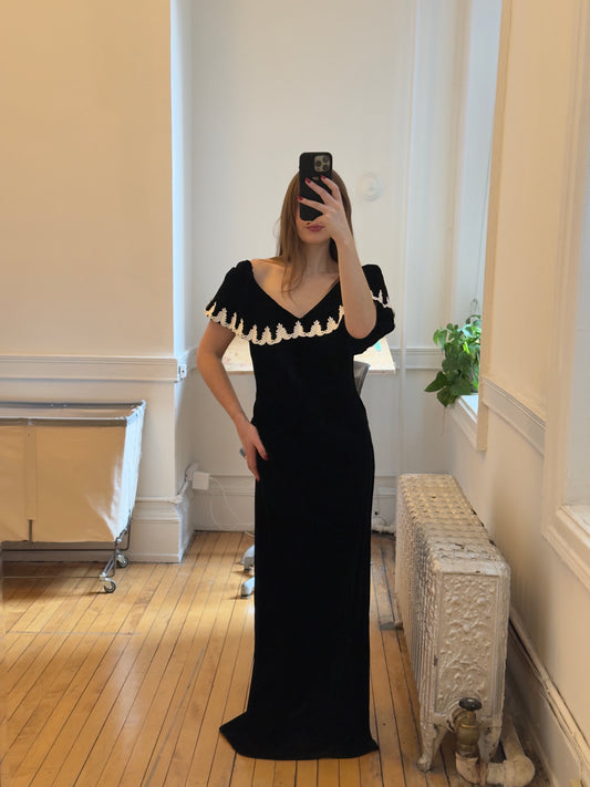 Vintage 80's Black Velvet Off-The-Shoulder Evening Dress
